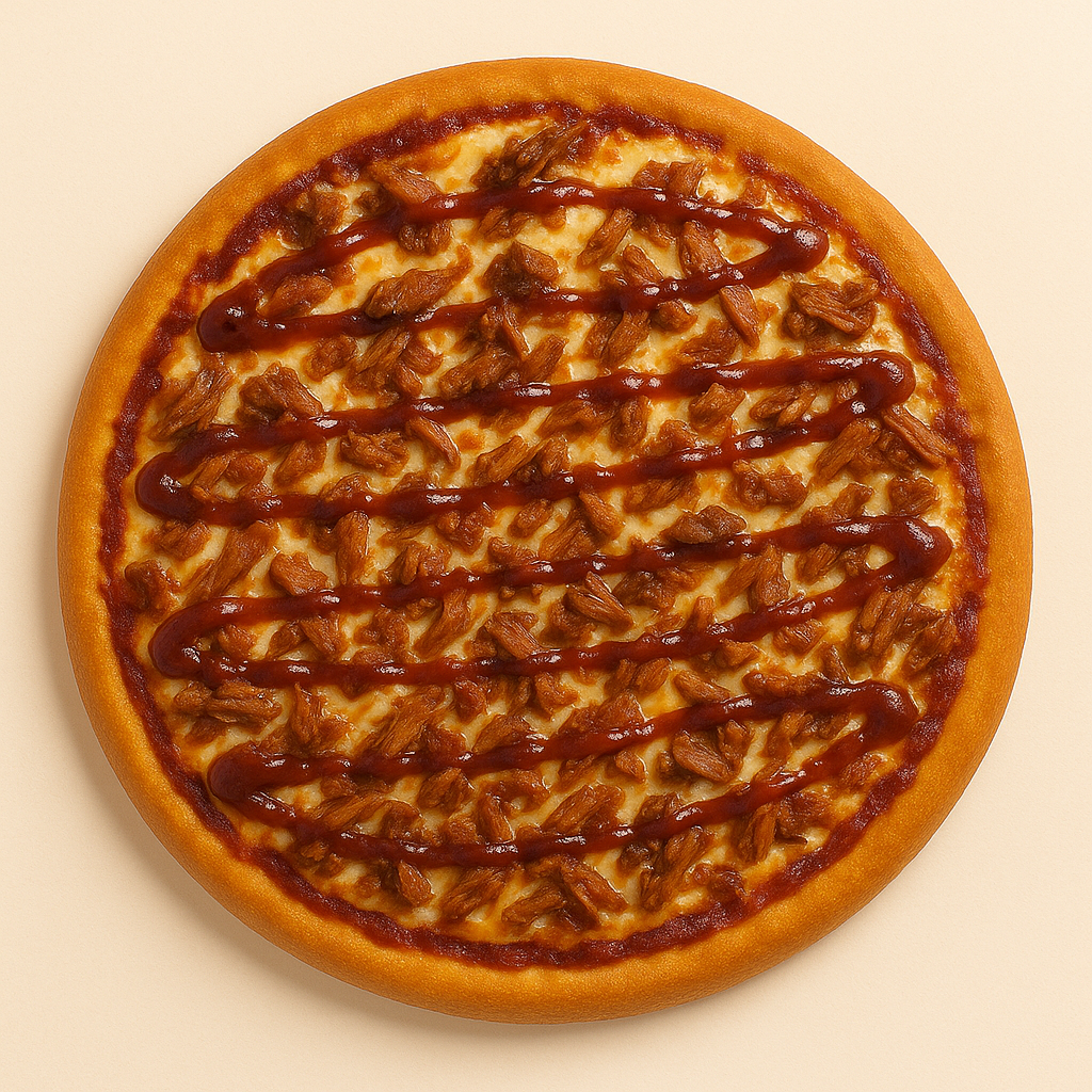 Pizza with BBQ sauce as a base topped with BBQ pork, cheese and a drizzle of BBQ sauce. We use Little Baby Ray’s BBQ sauce for the base and drizzle.
